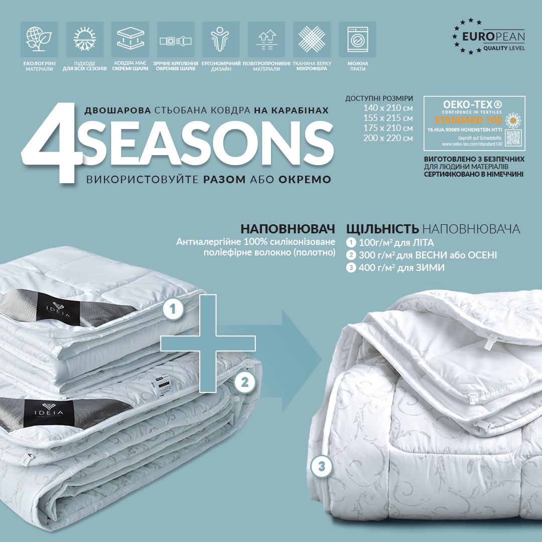 Ковдра 4 Сезони Зима–Літо від TM IDEIA — зручне та практичне рішення для будь-якої пори року. У комплект входять дві окремі ковдри: легка літня щільністю 100 г/м² та тепла зимова щільністю 300 г/м².