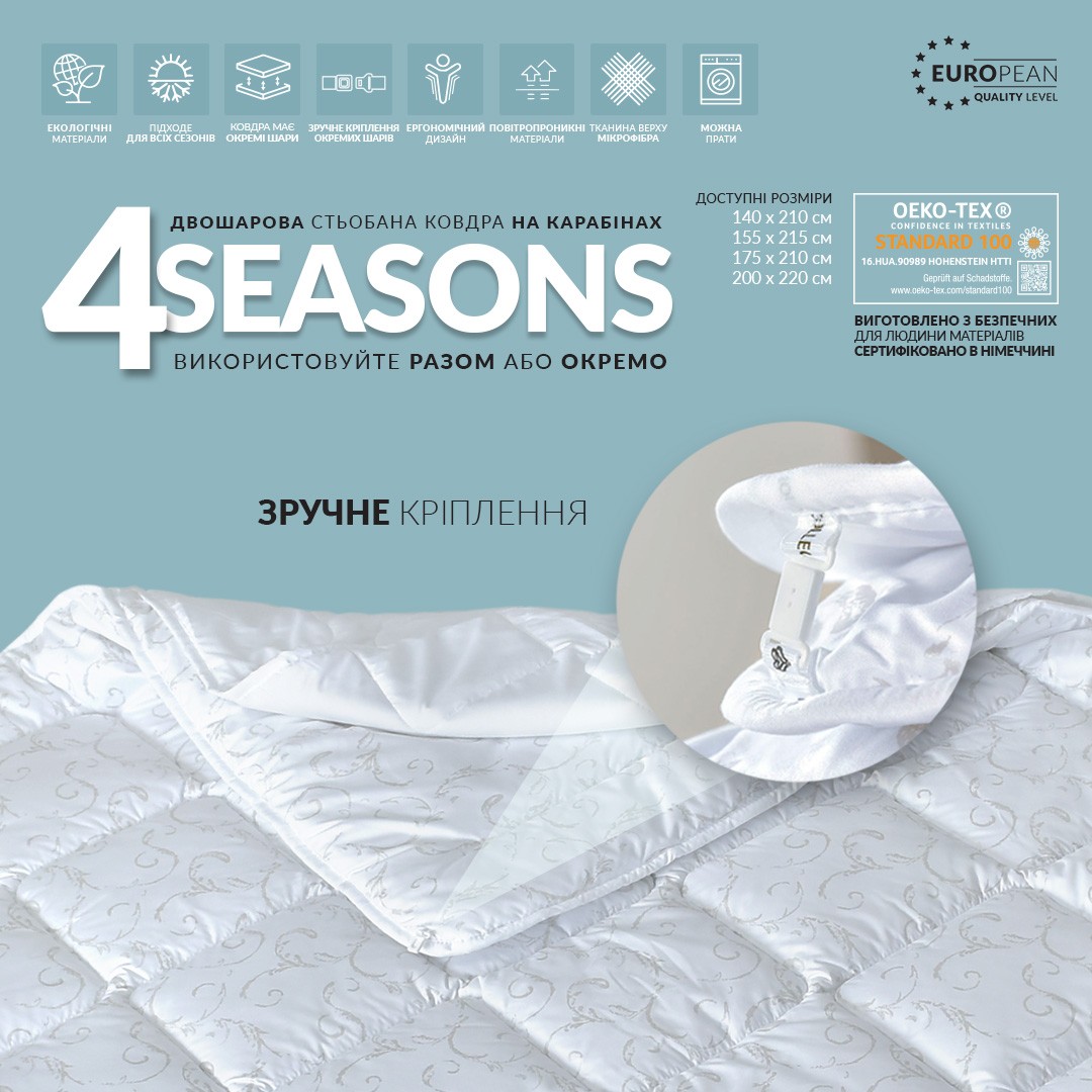 Ковдра 4 Сезони Зима–Літо TM IDEIA — універсальний набір із двох ковдр різної щільності для комфортного сну протягом усього року.
